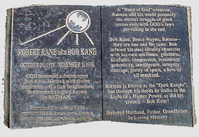 Bob Kane’s grave has no less than nine words to describe how awesome he was, and how he and Bruce Wayne were really one. Feel free to roll your eyes.