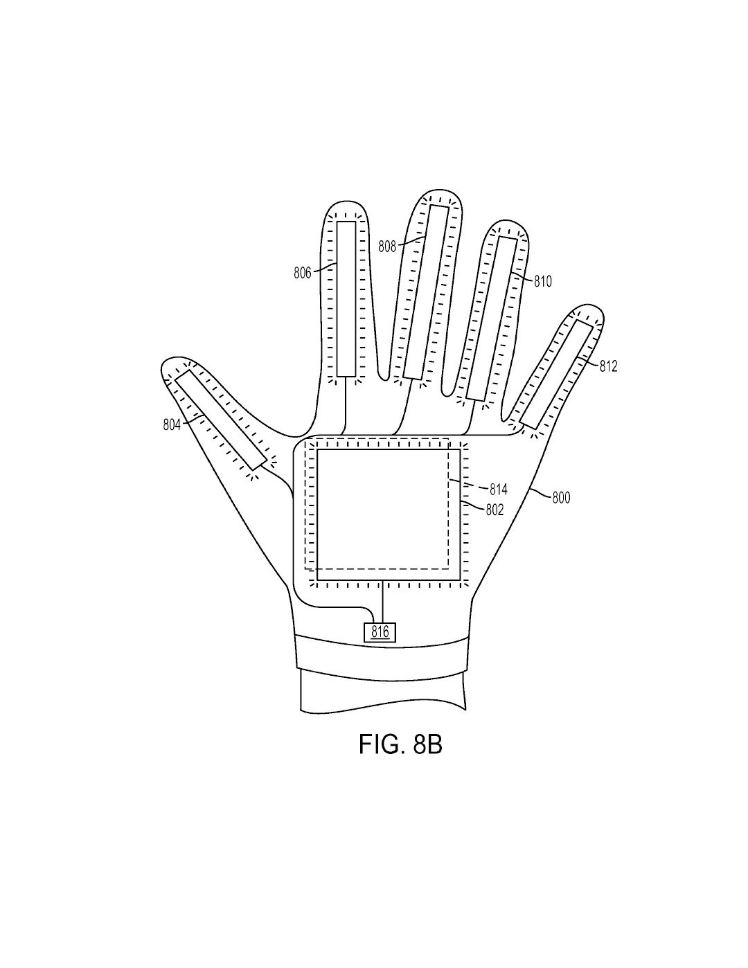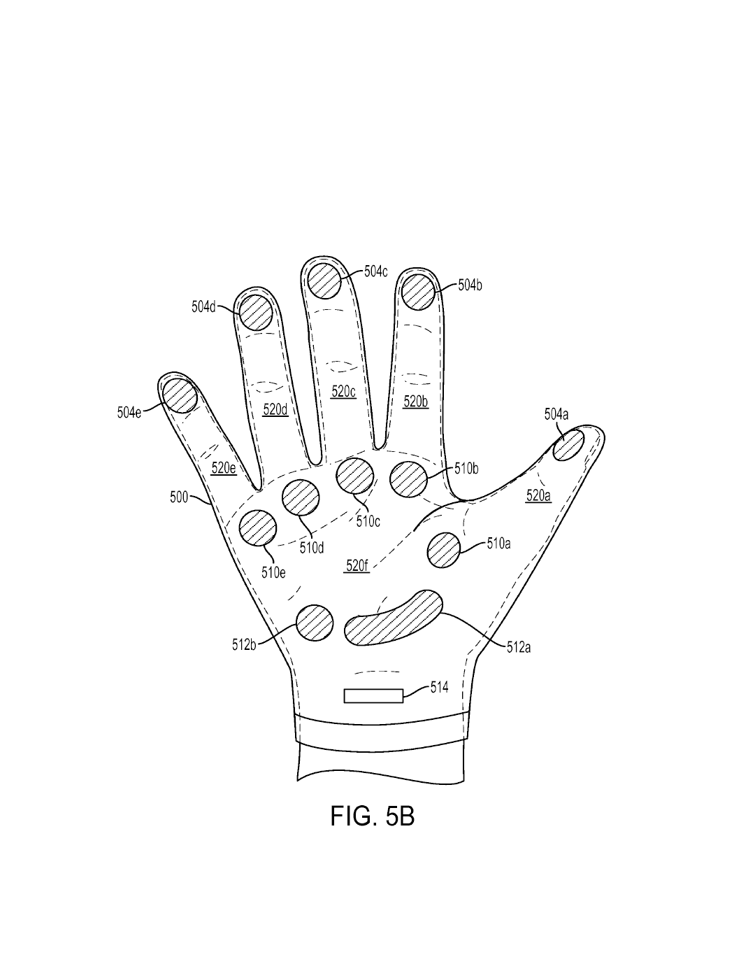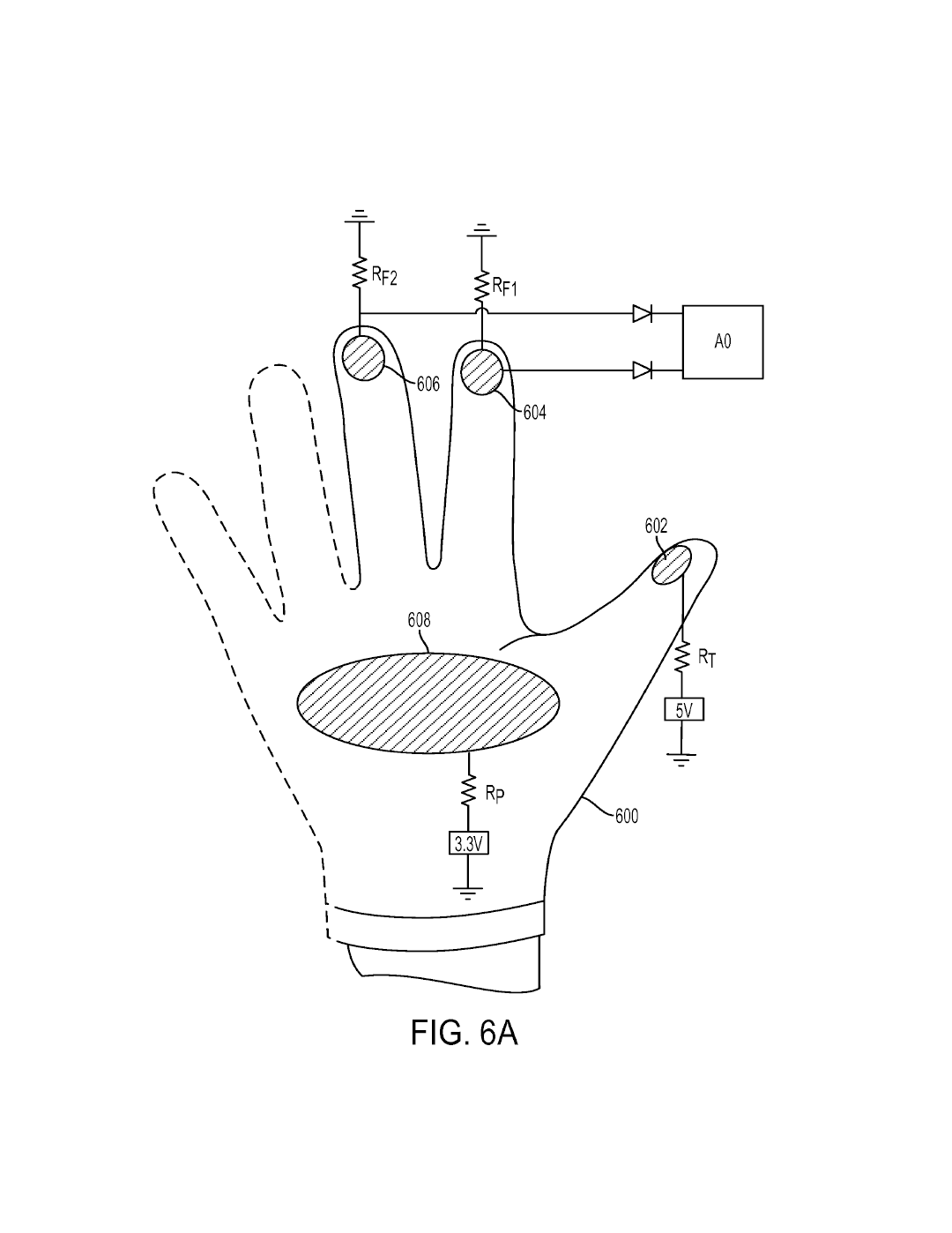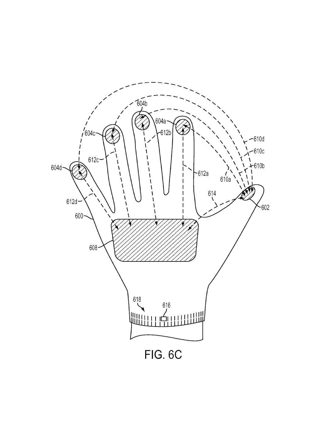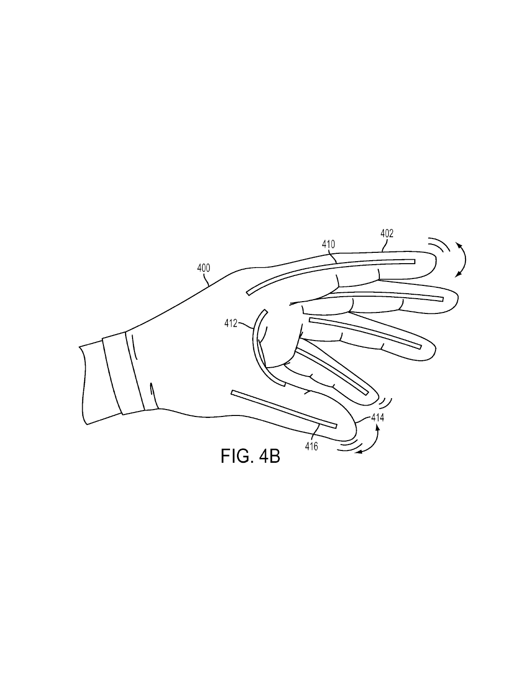 The extent of the patent show the “glove” having multiple flexible sensors in it, and may provide force feed back. Take note that the glove may be able to read gestures, and take them in as commands.