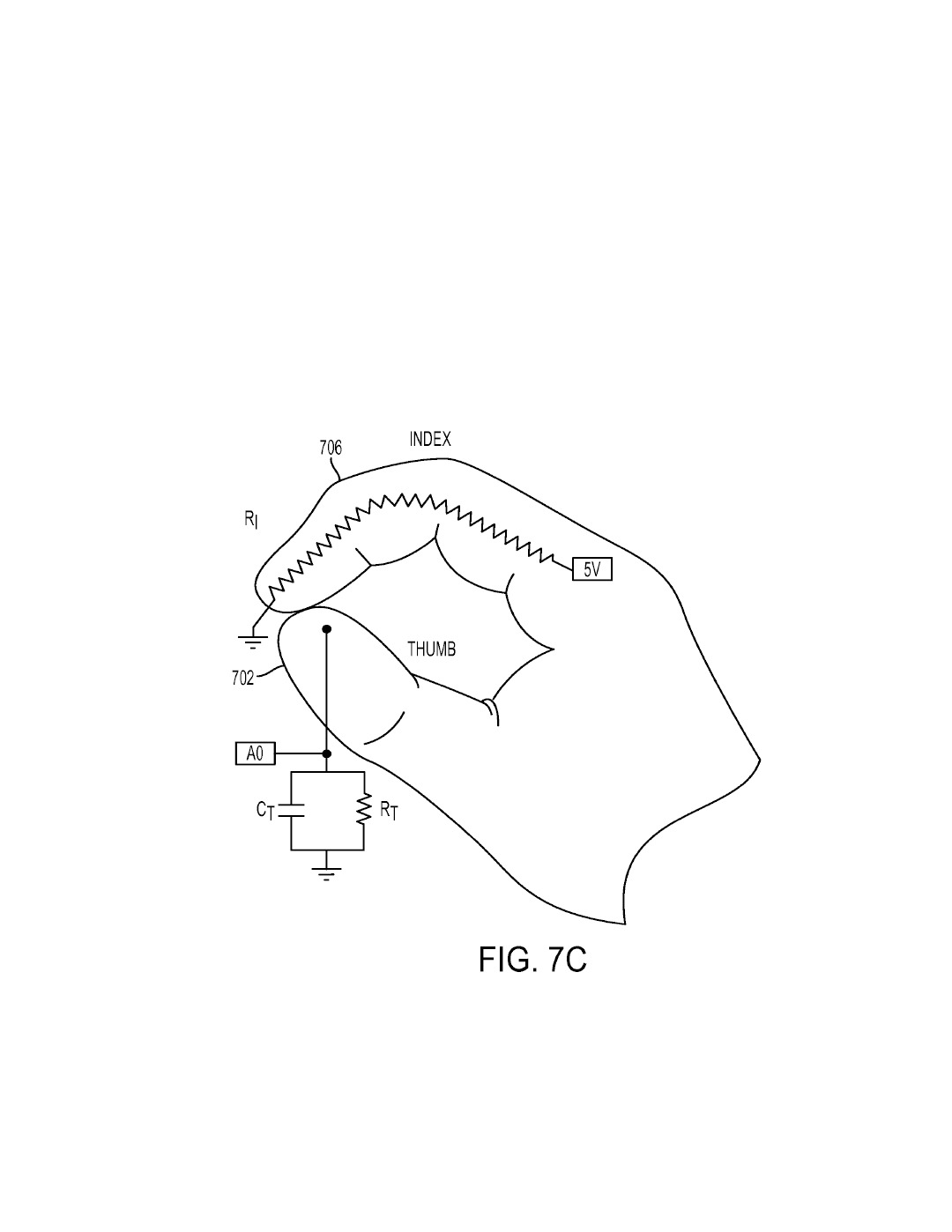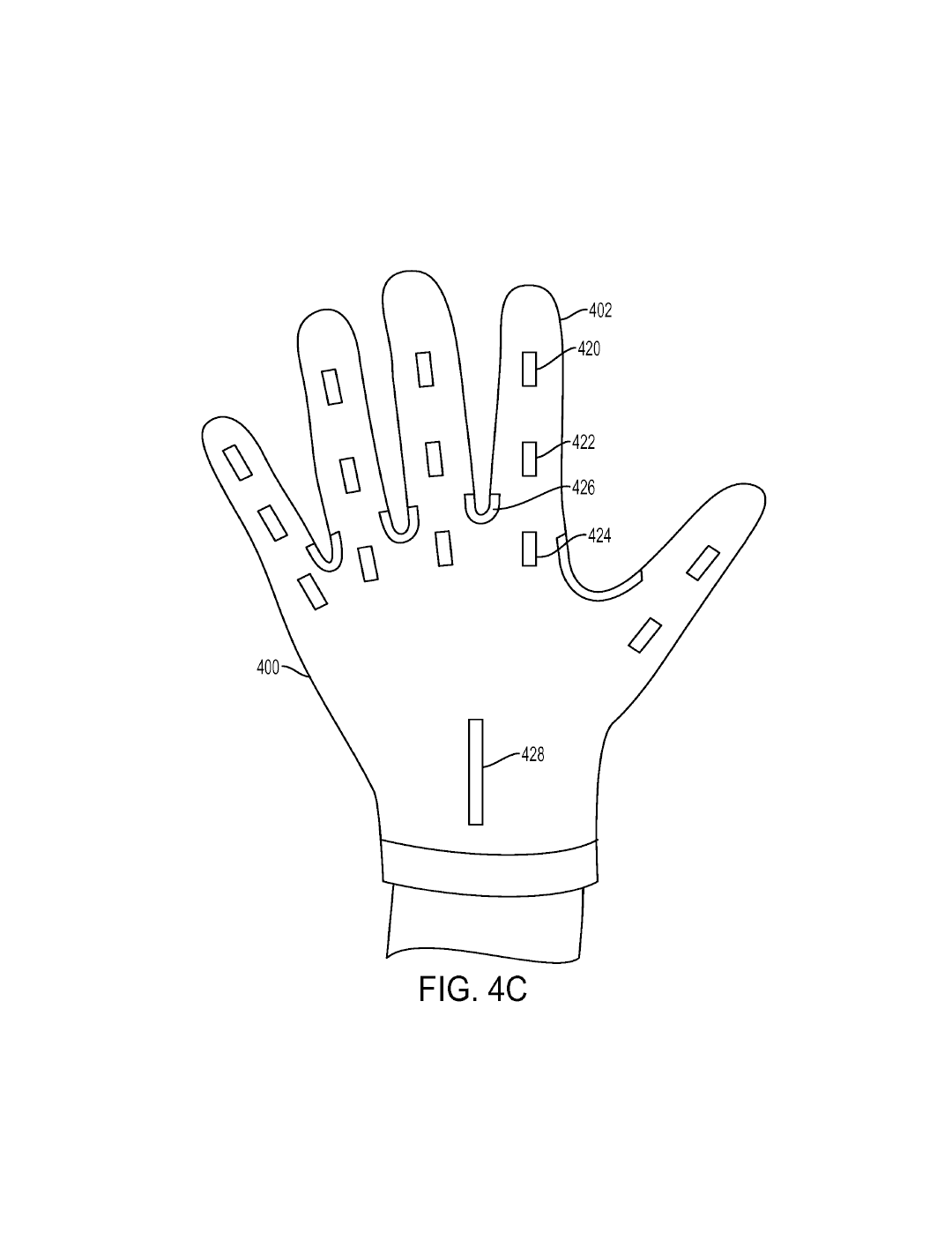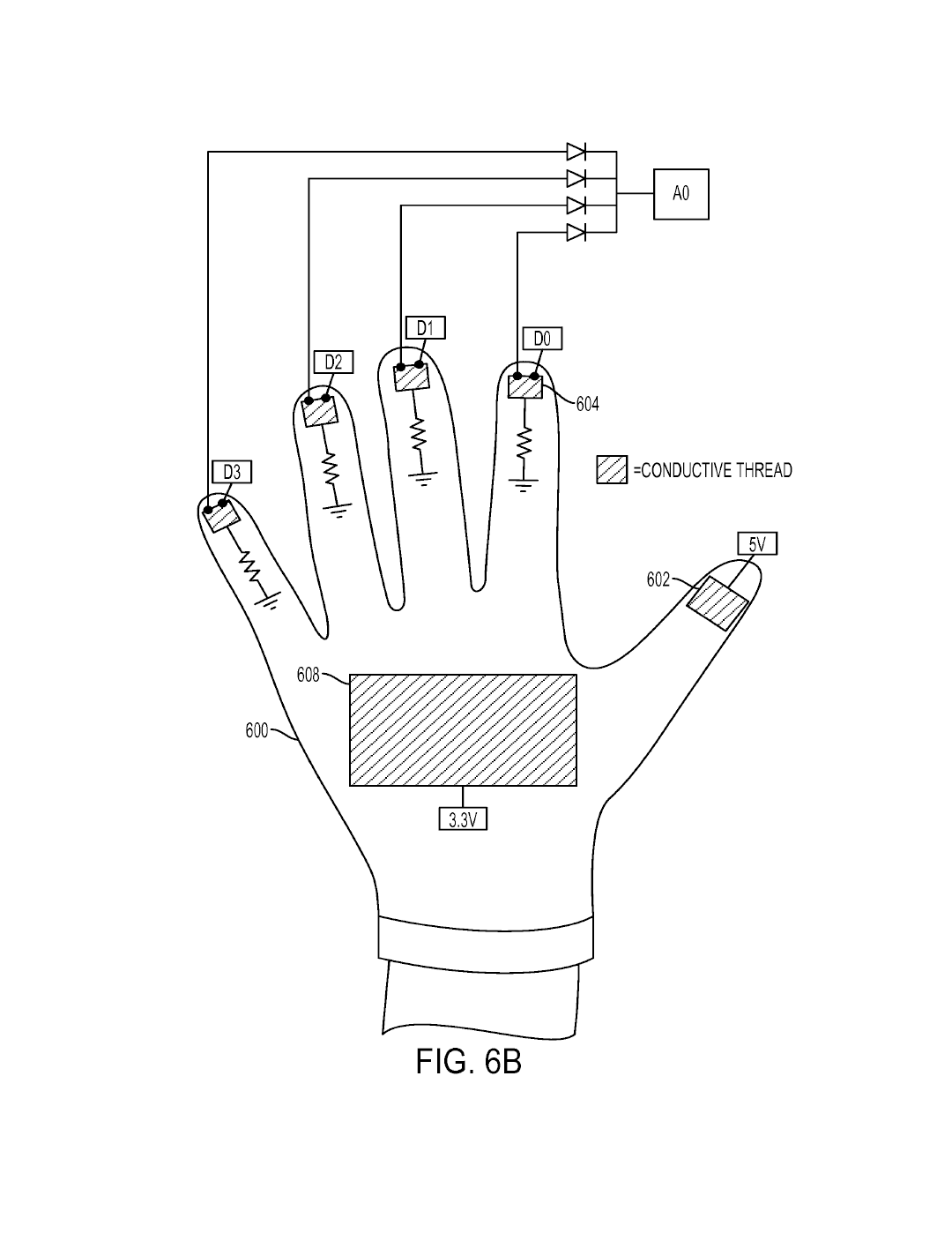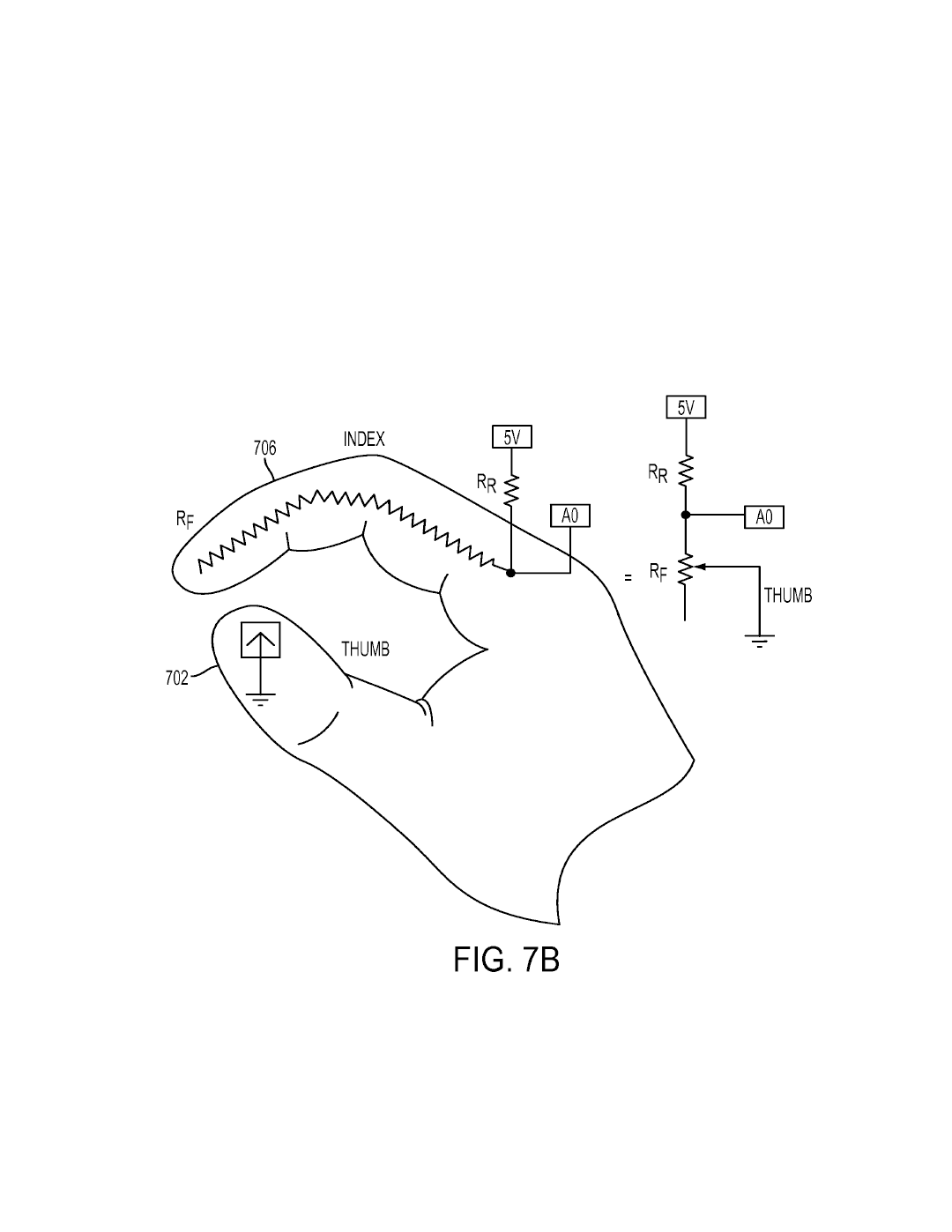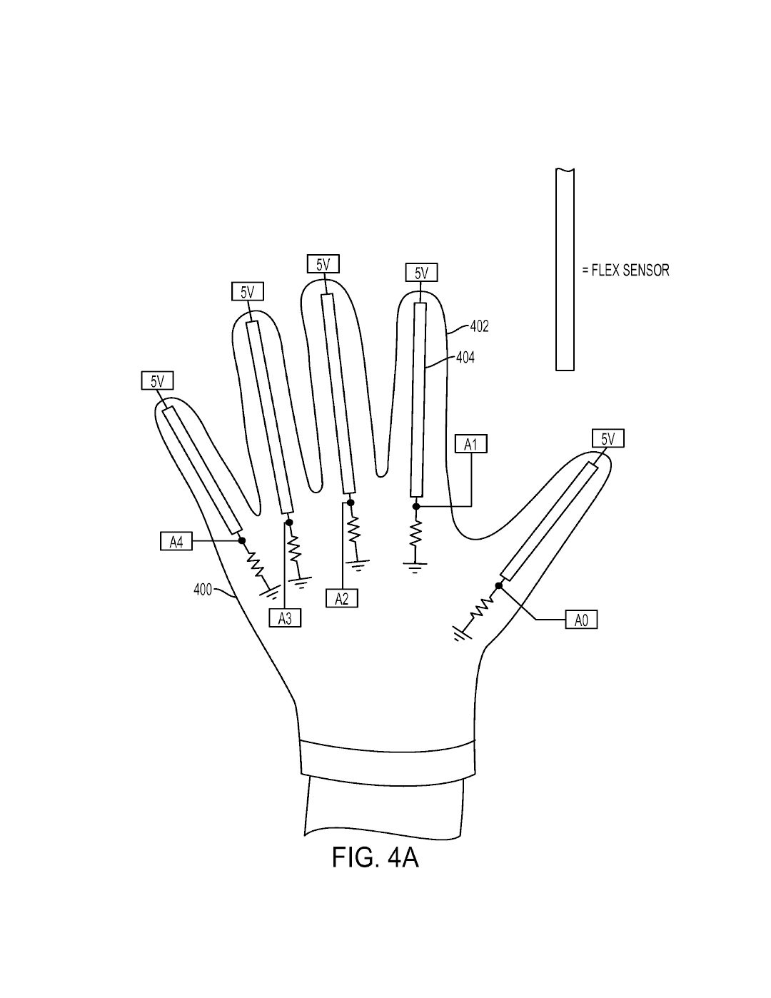 The extent of the patent show the “glove” having multiple flexible sensors in it, and may provide force feed back. Take note that the glove may be able to read gestures, and take them in as commands.