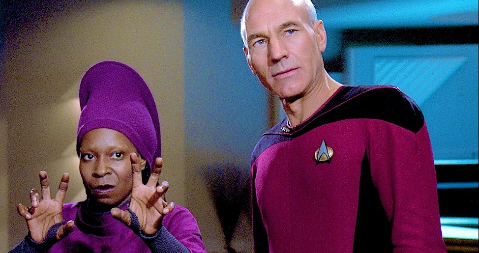 Season two cast addition Whoopi Goldberg makes weird finger puppets at Q while Jean-Luc tries to figure out what the hell is going on.