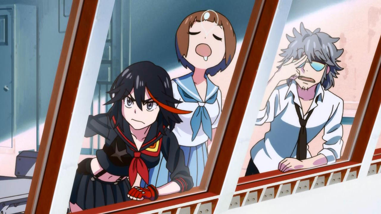Another strange part of this show are the outfits. Early on, Ryuko learns some of the students have uniforms that are like super suits. She tries to fight a student who has on one such uniform and is pummeled. After retreating, she comes across a mysterious and violently animated sailor uniform which also happens to be a super suit. Where did it come from? How does it work? Why does it have to be so naked?! The show does a good job of being self aware by having Ryuko question the size/look of the outfit. She is obviously uncomfortable about the lack of coverage. Remember I said this was a popular cosplay? Yep. There were many ladies and even some guys wearing Ryuko’s outfit (or even some Lady Satsuki’s outfit). The show is packed with fan service. Even the opening sequence has boobs flopping around for no real reason. Other characters are aware of the indecent exposure and the writing is pretty funny with everyone’s commentary.