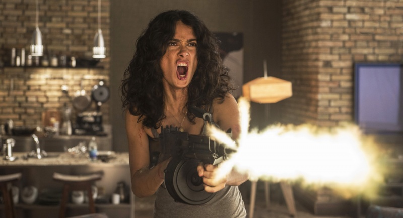 Salma Hayek stars as Everly, a woman who is kidnapped and sold into sex slavery soon after the birth of her daughter. Now, years later, she is trapped in a hotel with other women in similar situations. The movie begins with Everly naked and defenseless following an offscreen incident of sexual abuse. She finds a gun that’s been stashed away for her and proceeds to kill everyone in the room.
