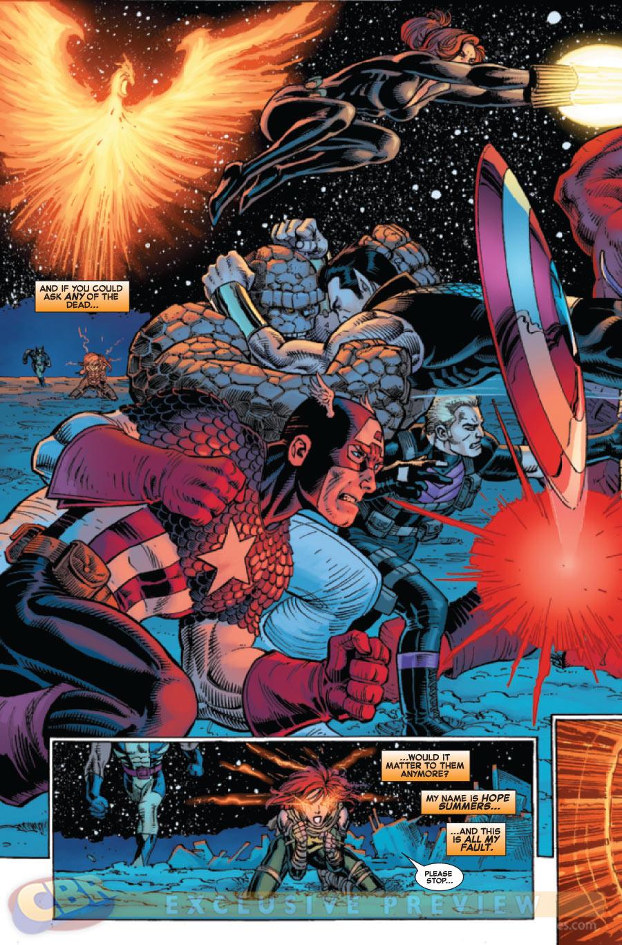 ISSUE #1! I love the opening, with the father and son on their farm and then their planet gets blown to shit by the Phoenix. Quick and brutal. The Avengers then have a terrible time catching a crashing plane and a jet engine. It takes almost 6 pages and makes you wonder how they survived all of those Nazi Gundams. A building gets broken and pieces and people fall and those people that hate Mad Men because of 9-11 probably got furious. The plane got busted up because Nova crashed through it. He warns the Avengers that ‘it’s coming’ and then passes out. There’s a weird conversation between Iron Man and Protector that comes off like a bad improv scene. It’s the only Bendis strike in the whole book.