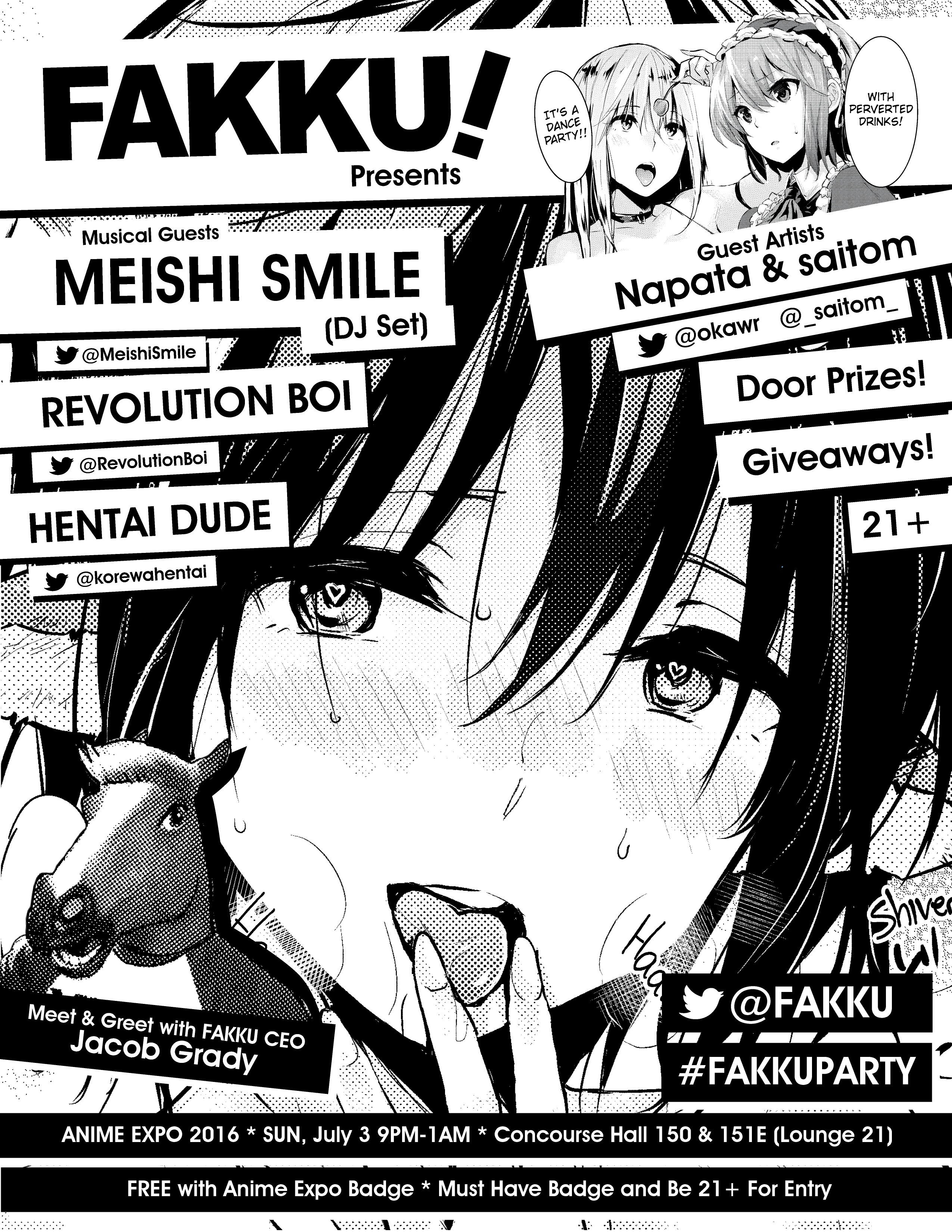 This year, FAKKU is also an official sponsor of Anime Expo! We’re throwing a big party on June 3rd at Lounge 21 at the convention center! It’ll be from 9PM-1AM and we’ll have an area for photos with the guests, drinks, giveaways, and live music! There will be three sets by HentaiDude, Revolution Boi, and Meishi Smile. It’s the first time we’ll be hosting an event of this size and I couldn’t be more excited. I’m ready to party! And anyone who comes through the door gets a free 7 day subscription to FAKKU. Be there!