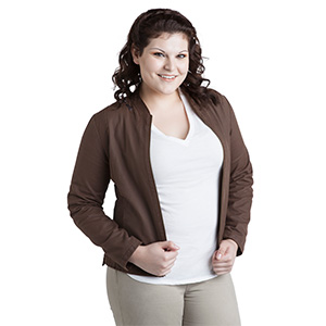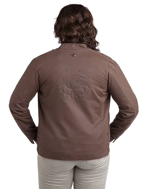 The first jacket, a short jacket with a front zipper, is 65% cotton 35% acrylic, and has detail stitching on the back of the Eye of the Sheikah in light blue thread on the back. The lining is tan, with a patterned print of the Traveler Shield.
