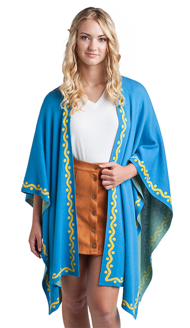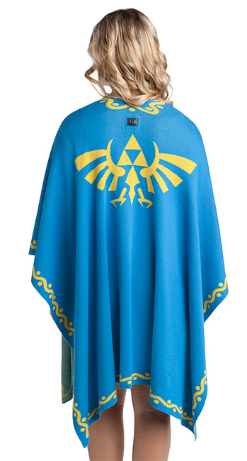 I was happily surprised when I got to feel the textiles from the BOTW clothing line. Made of 100% cotton, the ponchos and hoodies on display were amazingly, buttery soft – they’d be perfect for wrapping yourself in at the office or at home this fall when things start to get a little more chilly. One was bright blue with a yellow Hylian crest on the back – the other is a fawn color, and was inspired by Link’s Hylian hood.