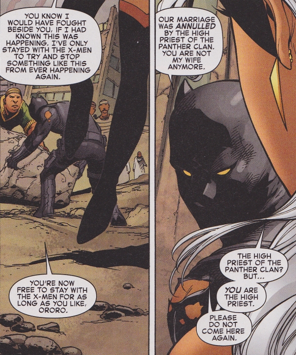 And good riddance too. When Marvel decided to marry their two most popular African characters, mostly because they just both happened to be African, it was one of the dumbest story ideas ever. It killed Storm as a vital member of the X-Men (“hey everyone, just dropping in to say hi, even though I’m Queen of a whole nation now. Remember when my character mattered?”) and forced Black Panther stories to involve mutants. It was all so lame, and in my opinion, kinda racist. I have to admit, one of the best moments of the series was when Panther tells storm the high priest of the Panther clan has annulled their marriage, and Storm says “but you’re the high priest” or words to the effect, and he just glares back. Cold T’Challa. Cold.