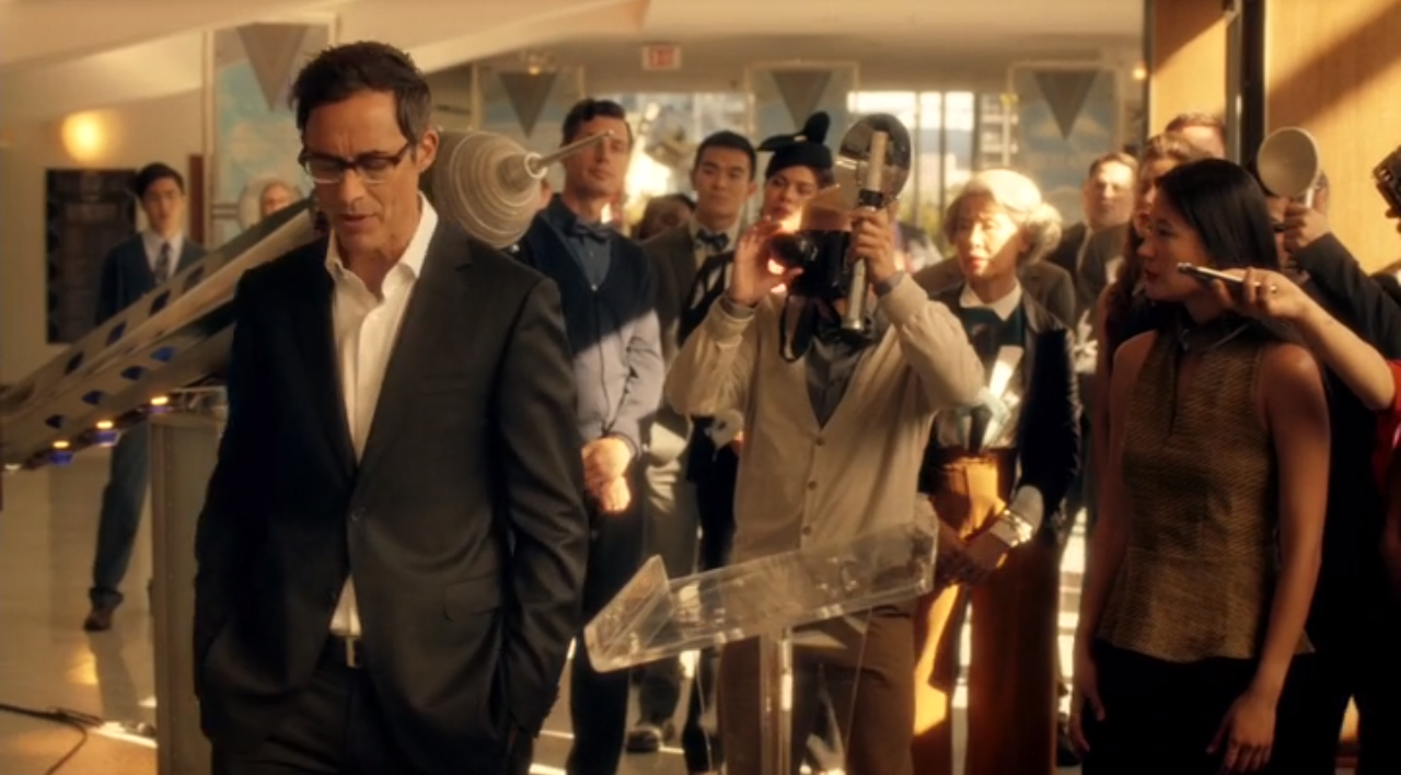 The episode opens 8 months ago in Earth 2. Here, Wells is speaking to citizens of Central City as he is announcing a new watch that can detect meta humans. The timeframe of the particle accelerator explosion fits the timeframes of both Earths. The announcement is then interrupted by Jay Garrick, who promptly accuses Wells of creating meta humans and creating Zoom.