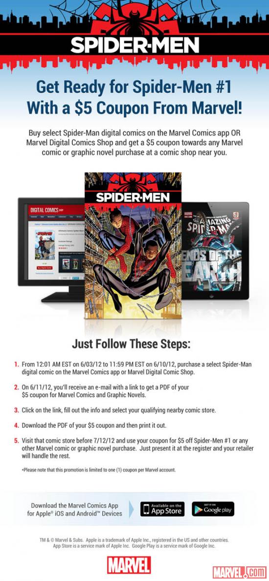 Beginning on June 3 at 12:01am EST to 11:59 pm EST on Sunday, June 10, when you purchase *select* Spidey books on the Marvel Comics app or the Marvel Digital Comics Shop, you will receive an e-mail/coupon (on June 11) good for $5.oo towards any comic book at your local shop. So basically, you buy the latest issue of “Ultimate Spider-Man” and you can get “Spider-Men #1” for free.