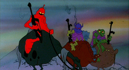 I’ll have more money— Wizards was done on a million dollars!  That was almost undoable, if it wasn’t for my professional-grade animators, I wouldn’t have made it.  It was these guys that came behind me and I think that now the young kids would come behind me.  They didn’t then, which is hard—no one believes that, but it was the older guys who were tired of what they were doing!  They’d done all this stuff all their lives, they were grown men.  They couldn’t believe it, they were so happy at my studio.  They were so happy.  They’d come in and say, “Ralph, do you really want me to do this?” and I’d say, “Yep!” and they’d say, “You’ll really let me do this?” and I’d say, “Go do it, Irv, and leave me alone,” and they were great animators and they did it.  But they couldn’t believe that I was allowing them that kind of freedom.