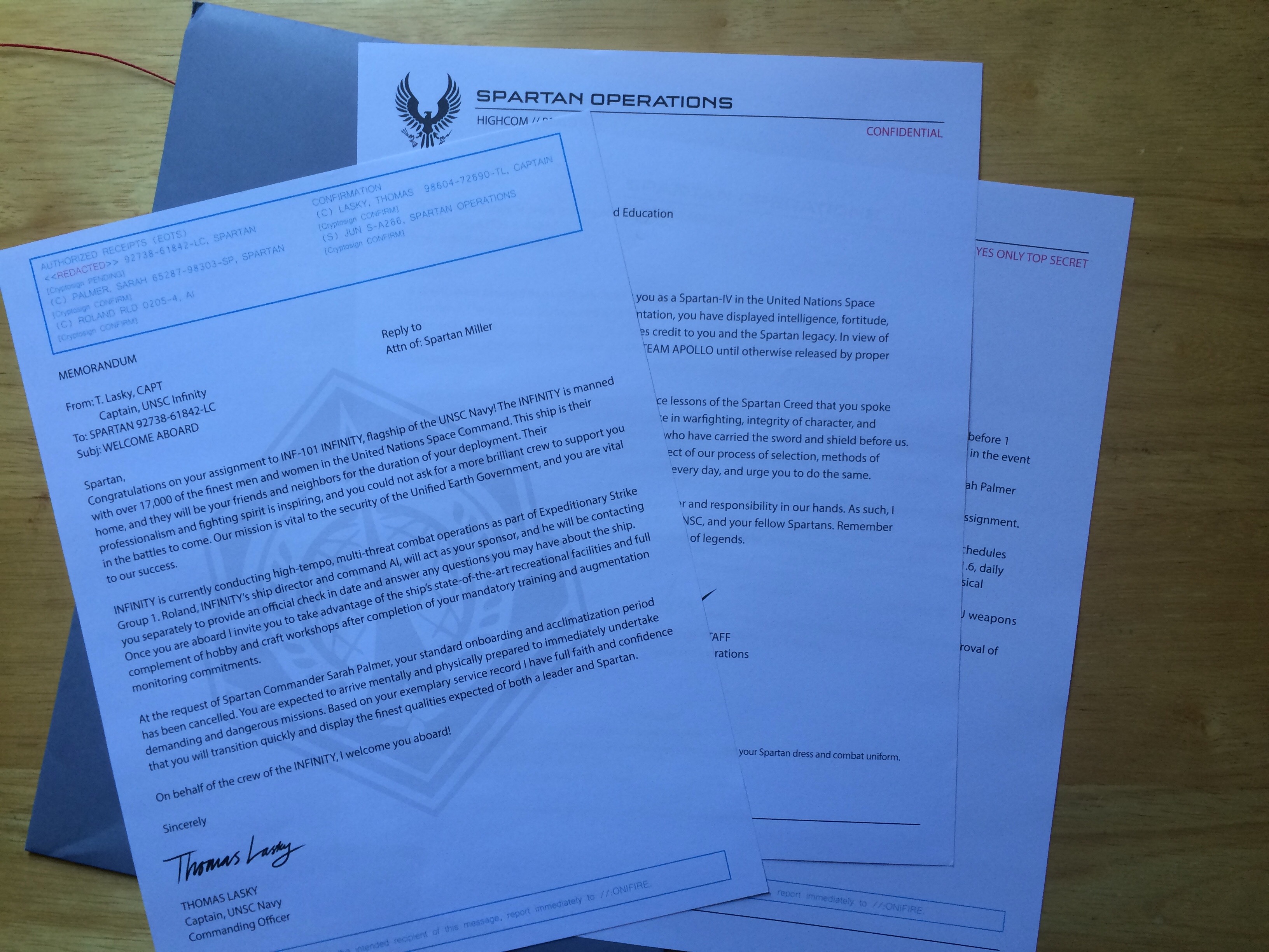 Another item featured in the crate is a is what the creative team is calling a Data Drop. This drop comes in an envelope and is consistent with the Fireteam Apollo recruitment theme. The drop contains letters from Thomas Lasky and Jun, two very prominent characters in Halo lore.