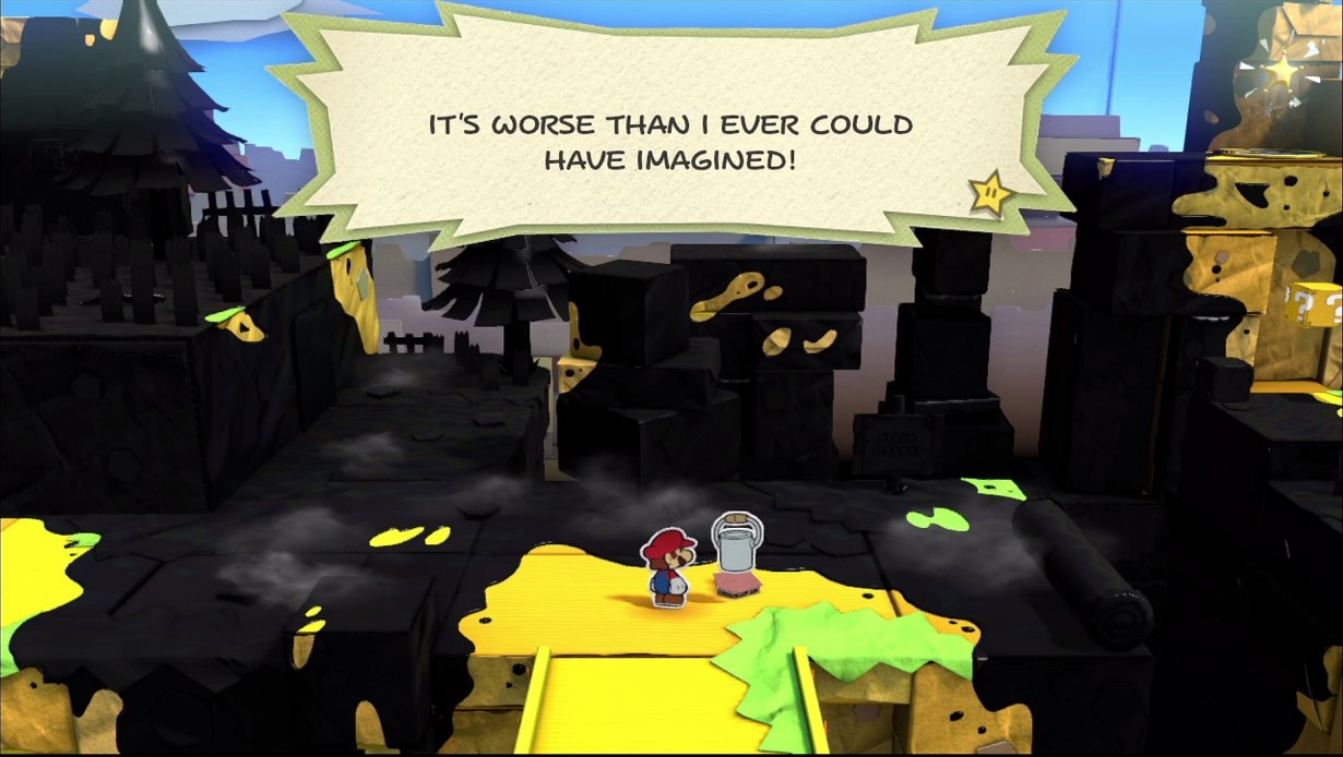 color-splash-bossSadly, the rest of the gameplay also fails to provide anything resembling fun. Most of your time will be spent running back and forth between different levels in order to find specific items and collect paint stars to open up new areas. Progress is often slow, and tedious. I’m not kidding when I’m telling you that you’ll be spending a good 5-7 hours at the start of the game just trying to get to the first boss. This is the main part of the game, and it’s really frustrating that it artificially extends itself out. Not only that, but the game can be very cryptic at times, so you might spend a good hour or 2 mindlessly wandering a level because you missed a small piece of paper sticking out of a bridge that’s integral to beating that level. After a while, not even the music or visuals can keep you going.color-splash-mapIn conclusion, Paper Mario Color Splash may seem like a step in the right direction, but is still a ways off from the original 3 entries. The biggest problem is that developer Intelligent System seemingly ignored all criticism leveled at Sticker Star and simply just tried using a handheld style approach for a console. It seems like this new team just doesn’t understand what made the series so beloved in the first place. What does the future hold for our paper mache plumber? Who knows? Hopefully, it’s better than this.color-splash-final