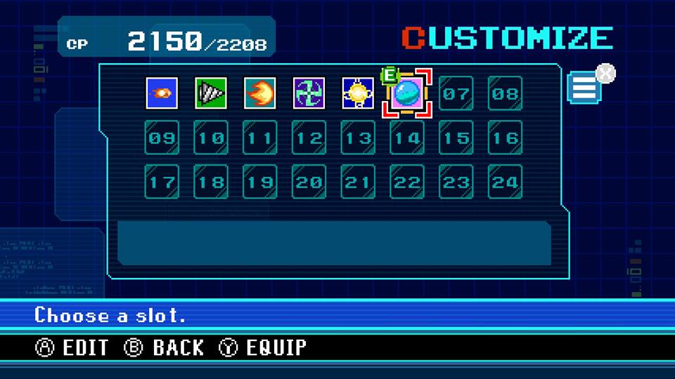 The gimmick for Beck’s story is the ability to freely customize your own weapons. You can change everything from number of bullets fired, rate of fire, bullet size, and much more. It can become super addicting trying out dozens of different combinations. One of the best parts is that you can actually change and customize your weapons during a stage! This opens the door for a lot of experimenting and trial and error. There have been times when I’ve been stuck in a boss battle and I’ll spend 10-15 minutes trying to create a new weapon to defeat them.