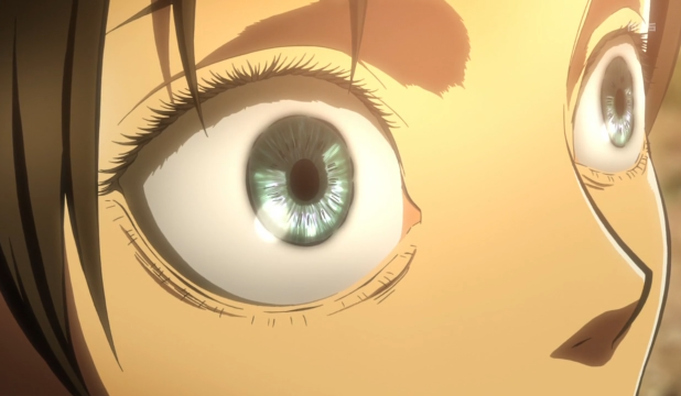 The show’s style is similar to Claymore and Akira with emphasized eyes that convey the emotional intensity of a situation. At times it can be a bit much but it goes with the overall heavy feel of the show. The outlines of characters are done with thick black lines and the overall color is nicely saturated. The actual animation is seamless and perfect to show how the characters zip around with the 3D maneuver gear and how bizarre the titans move.