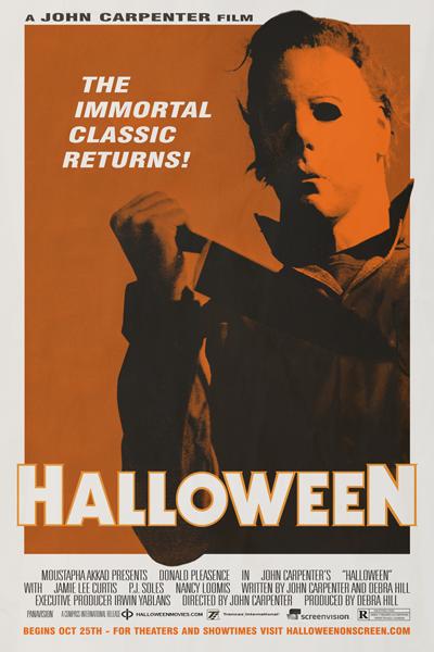 Compass International Pictures, Trancas International Films, Screenvision, and HalloweenMovies.com are proud to present the one sheet for this October’s U.S. theatrical re-release of John Carpenter’s 1978 masterpiece, HALLOWEEN. The poster, designed by artist Austin Hinderliter, marks the return of THE SHAPE to cinema lobbies across the country, presenting the ultimate evil in shadow and autumnal oranges.