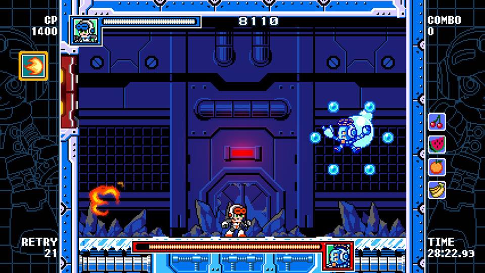 Gunvolt is the second character, and as previously stated, his gameplay is completely different and focused on other things. Gunvolt primarily takes use of another new feature in the game called the Burst mechanic. You earn a burst when you defeat an enemy up close. The more you keep a burst combo going, the stronger Gunvolt’s secondary weapon will be! It’s really fun getting a 15 burst combo going and then debating whether or not you want to risk one more encounter to get it higher. Both characters are different enough that even going through the same levels feel different and refreshing.