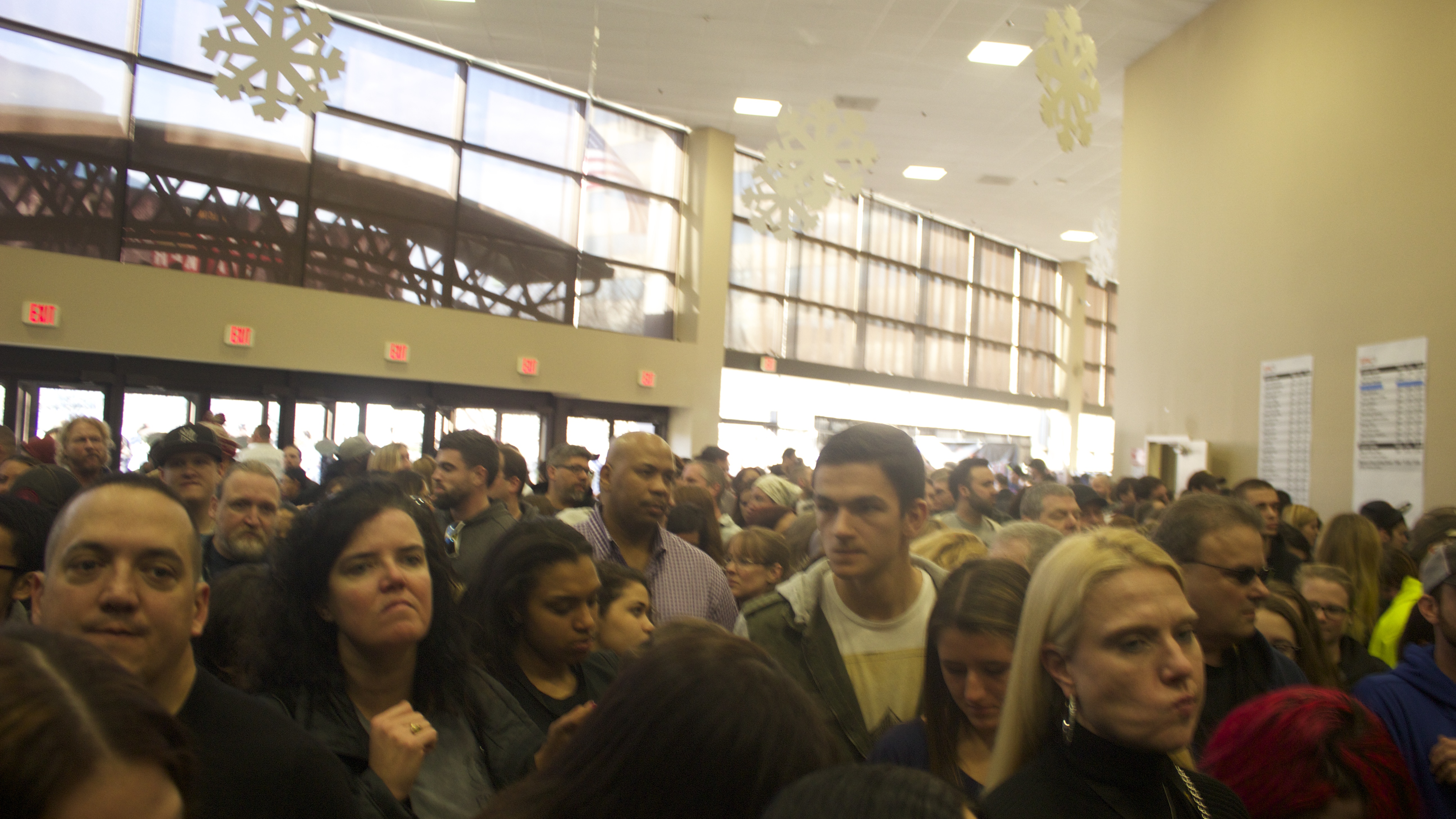 People are pouring out of the entrance. It’s a mess. On the far end there is a line wrapping around the edge of the sidewalk. On the other, another chaotic line wrapping itself on the ramp. In between, people are crowding around, standing and looking over each other’s shoulders. People are calling friends still parking blocks away. I sought someone who was a volunteer to ask where press registration was. Three words and my heart sank. “Inside the building.”