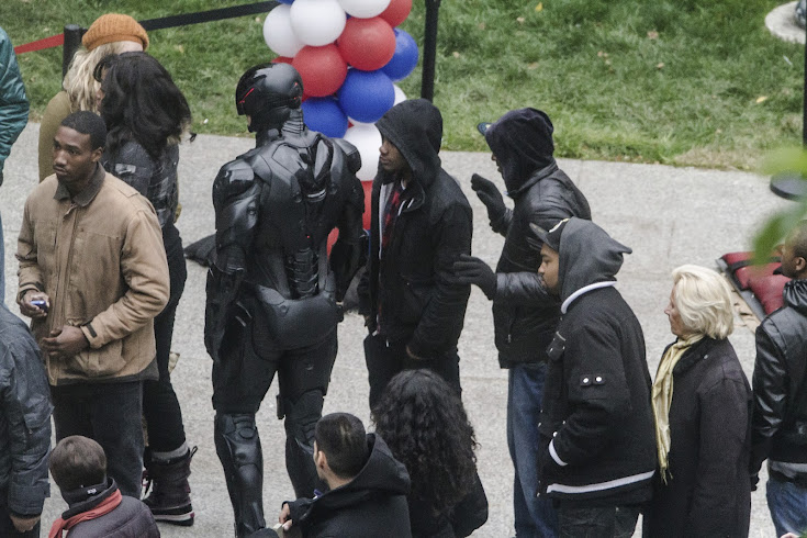 New set photos from the set of RoboCop provide an even better look at the new suit as well as a shot of Michael Keaton on set and what looks like RoboCop being used to deal with a protest. Personally, I love the look of the new suit and can’t wait for this movie. Check out the new images below.