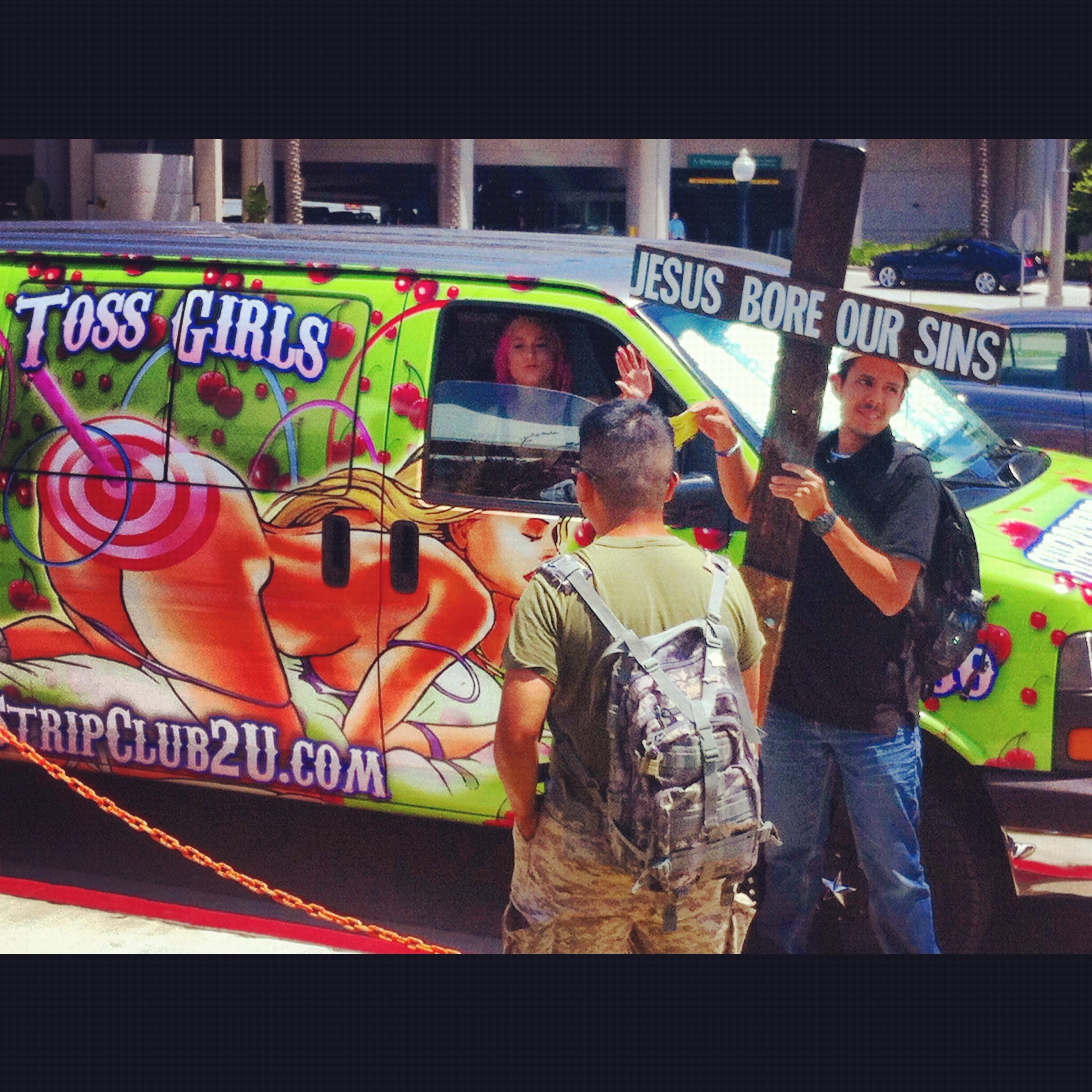 After that panel we went across the street and checked out the Batmobiles that were on display. It was awesome! Then we ran into Wil Wheaton at Starbucks before meeting up with Eric, who was in line for Hall H. We spent the rest of the day hanging out in line and relaxing, while holding on to hope that we would get into Hall H to see the Marvel panel. Sadly we did not get to see that but we did get to see a bunch of those crazy bible-thumpers try and convert people that were in line. Can I just say that I absolutly hate those guys, super fucking annoying. On the plus side though, we did manage to get an awesome picture of the Jesus guy   standing next to the booty ring toss van. Anal play and God together at last! Thus endeth my Saturday at SDCC.