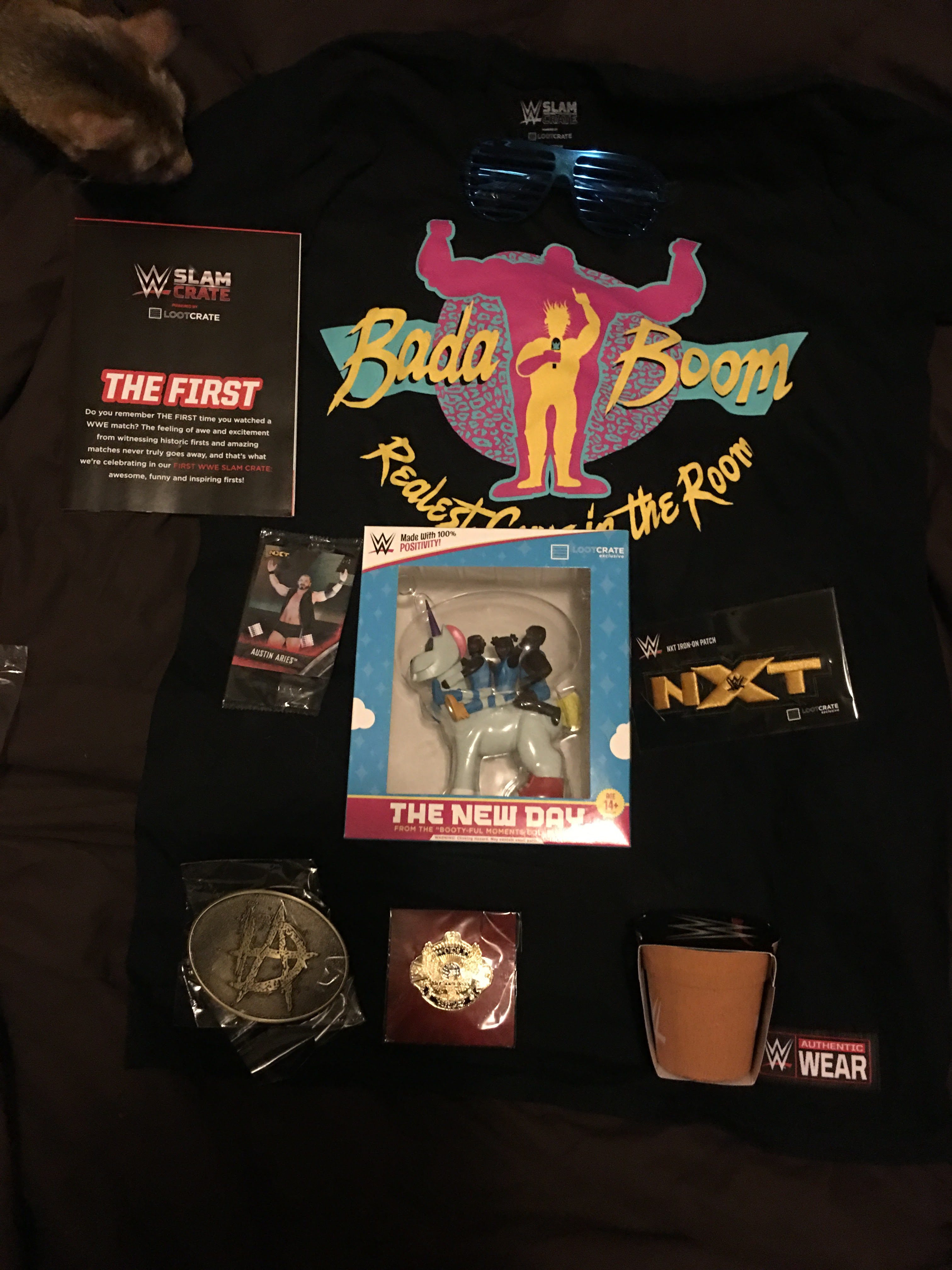The WWE Slam Crate has been hyped up for a few months now, marking the wrestling company’s first foray into the subscription crate business. From figures to shirts and pins, many wrestling fans were anxious to see what a WWE themed box would contain. Well, we’ve received our first crate, and the results are as varied as the many personalities that fill the roster. With that said, here’s what’s inside!