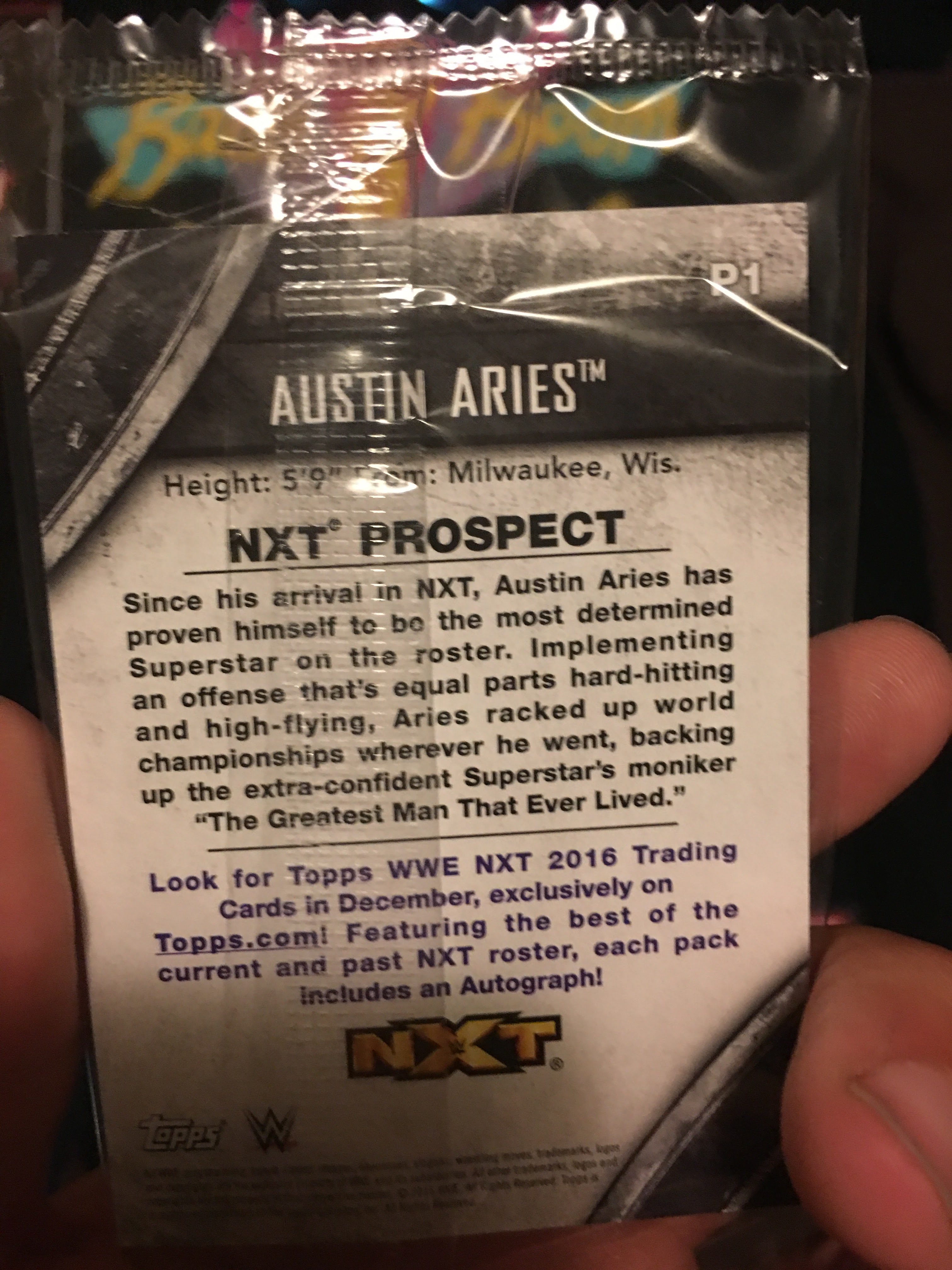 Representing NXT, we got two items showing off the future of the WWE. First, the NXT patch will let you literally wear your fandom on your sleeve, or wherever you want it to go! Then, a preview of the upcoming Topps NXT trading card line gives us a look at Austin Aries. Labeled as an “NXT Prospect”, the back gives a brief history of The Greatest Man Who Ever Lived. It’s a great way to introduce fans who don’t watch NXT or don’t follow the indies to a guy like this, even if it is weird that someone who has been wrestling for over a decade is being called a “prospect”. Still, I get what they’re going for.