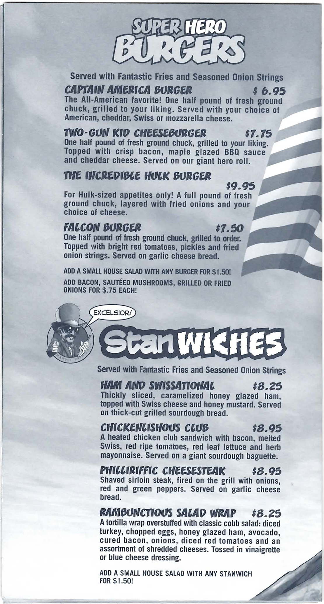 We may never know. But here, Geekscape has provided scans of the two original menus for you to look over… so that you can dream of a day, before Marvel was widely accepted as cool, when you could feed your feelings of geekdom alongside its largest symbols.