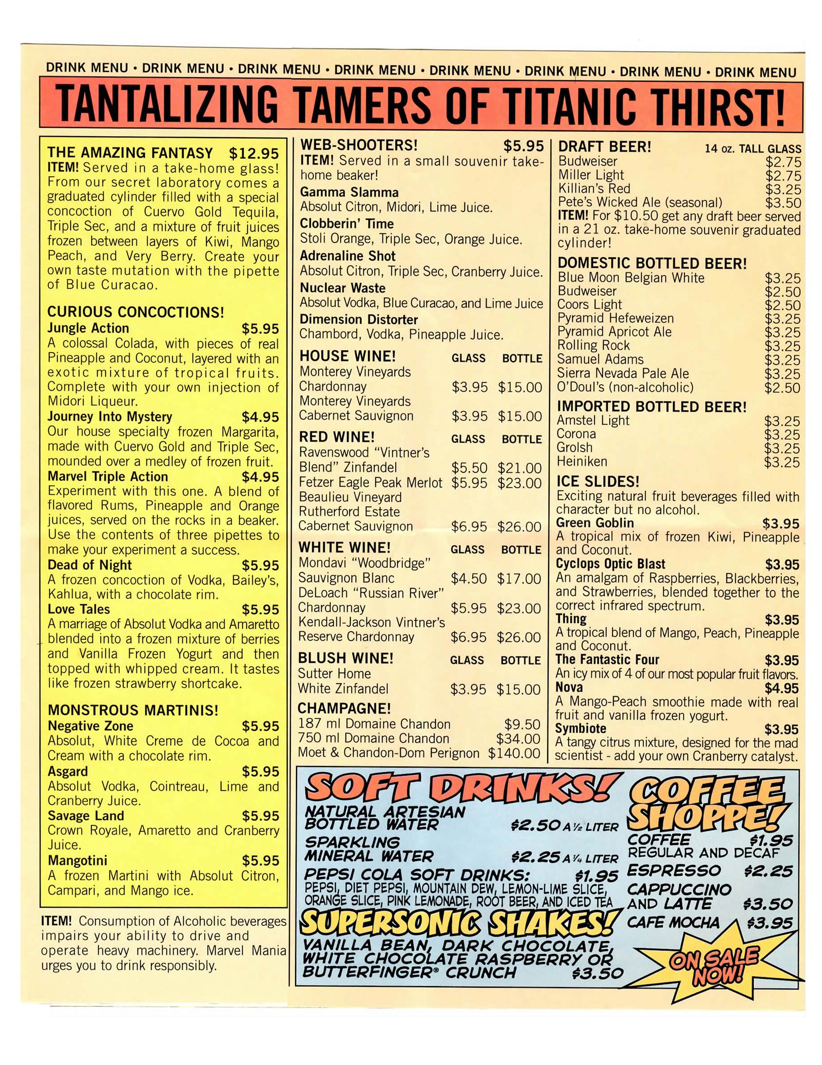 In November of 1998, at Universal Studios, the Marvel Mania Restaurant opened its doors for business. It offered food and drinks based on almost every Marvel hero (and villain!) that you could imagine. Sadly, it was closed less than a year later, in September of 1999. What happened? Why did it go under? What fiends were responsible (I’m guessing the chefs and the prices…)?