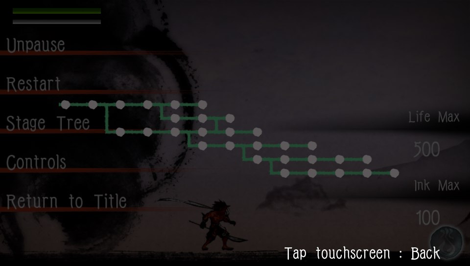 With the first two levels of the game, Sumioni: Demon Arts gets the player familiar with all the controls and the powers you have at your disposal. The main powers are your ability to paint lines using the touch screen on the Vita to create platforms that while standing on, you receive a power boost to your attack power. Getting hit or falling off the platform (they will dissipate over a short period of time) resets that boost. You can also switch to water ink and erase lines you have drawn on the screen or if you tap near a projectile, erase them as well. I found this to be very useful in the later stages when it becomes a bullet hell.