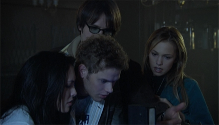 As we get some degree of introduction to the characters, we learn that the blonde is a psychology major, working on her thesis which, as far as I can tell, has absolutely nothing to do with psychology. Brunette is a red shirt, working on her five-finger discount and mad faux-lesbian skills. She’ll be the first to die, just before Mr. English-Ain’t-Mah-First-Language gets taken out by a rogue piece of rusty pipe. There are also three guys, but they’re indistinguishable from each other until about forty-five minutes in.